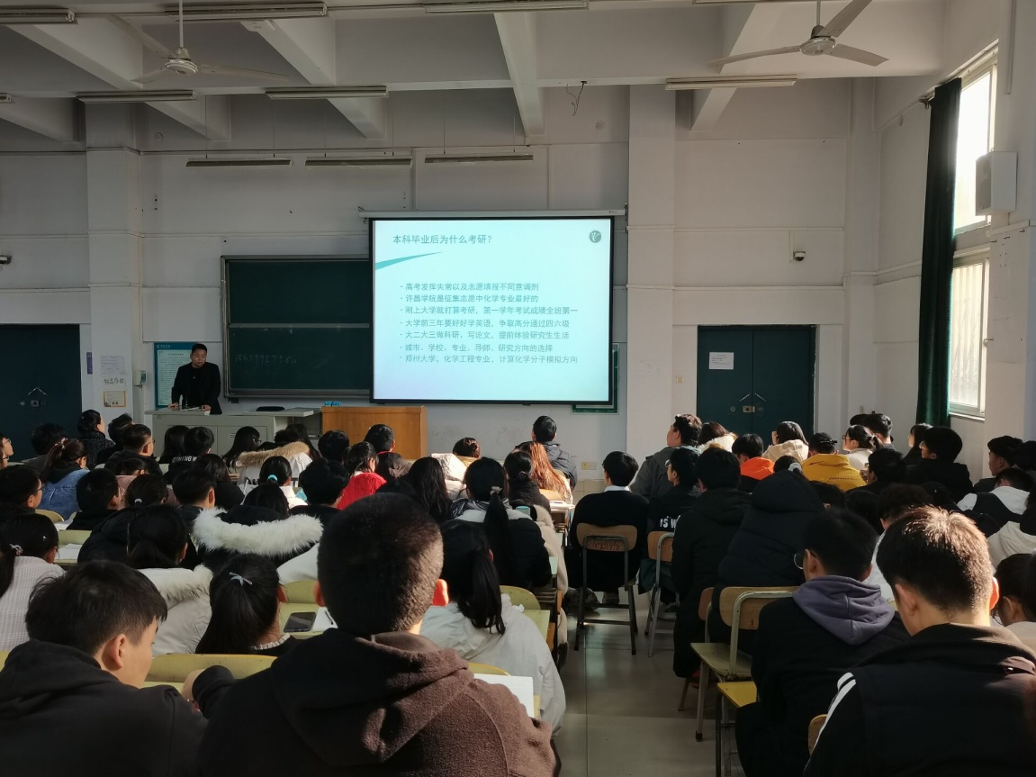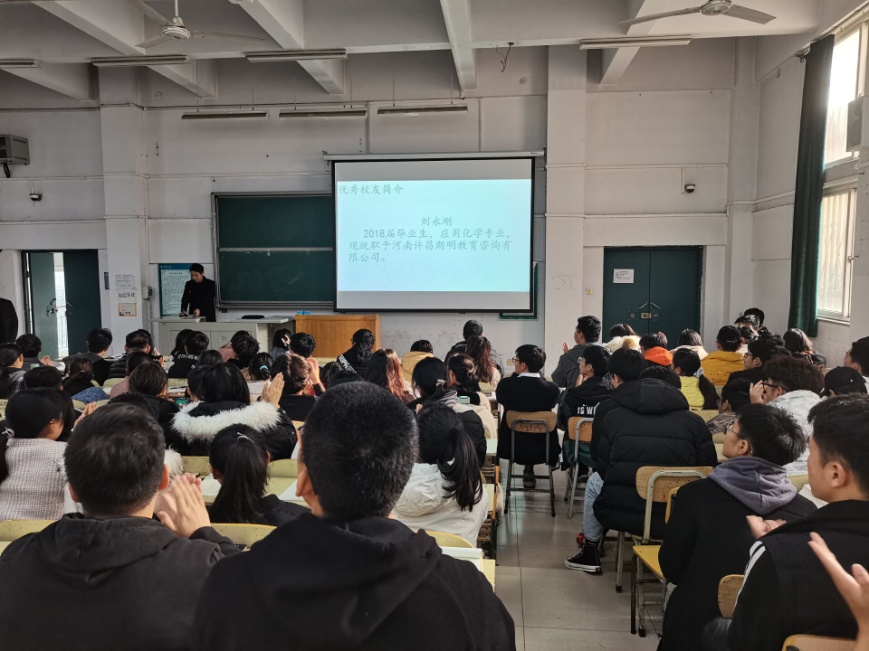 13届应用化学专业优秀校友李扬的报告以考研为切入点,详细介绍考研的优势、目标学校的选择、分科目阶段性复习等经验,同时介绍自己目前从事的专利代理人职业的发展前景和素质要求,鼓励同学们开拓就业思路,不断提高自身素质,提高自身职业竞争力。