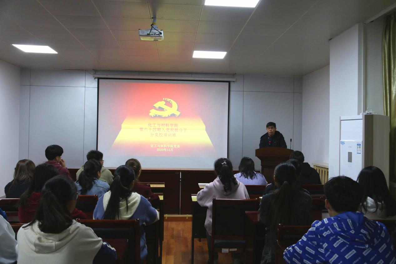 2020年11月6日下午5:30,我院于化工与材料学院S302会议室举办入党积极分子党课培训班开班仪式,会议由组织员胡泊主持,院党委书记许志红发表讲话,37名入党积极分子参会。