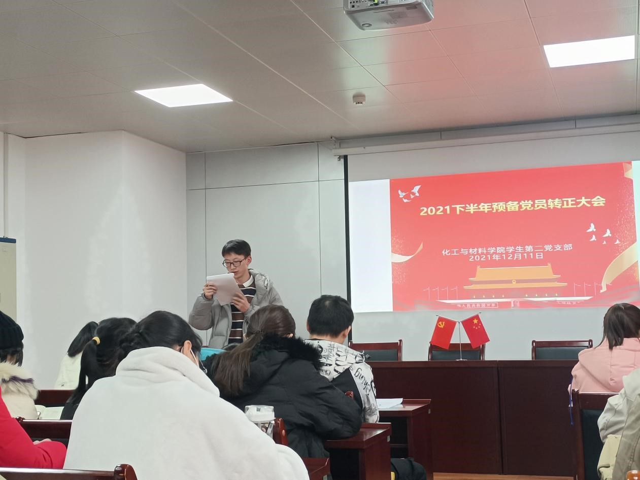2021年12月11日,我院学生第二党支部于化材楼S302会议室召开2021年下半年预备党员转正大会,学生党支部书记张东琳老师、崔占奎老师、蔡锟老师及支部全体学生党员参会。