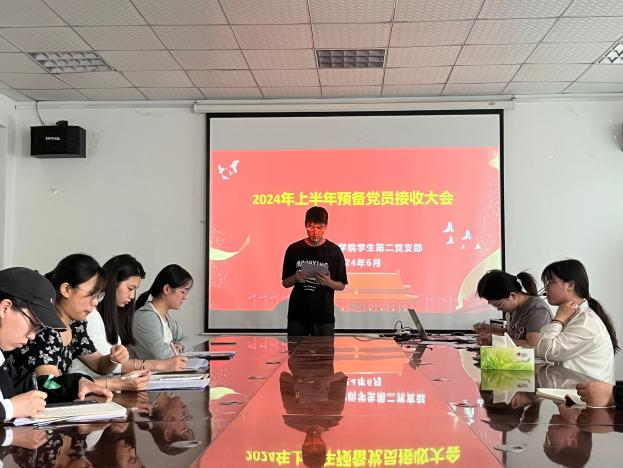 2024年6月13日,化工与材料学院学生第二党支部于A4-301会议室举行2024年上半年预备党员接收大会,主要对董旭等5名同志能否入党进行讨论和投票表决,本次会议由学生党支部书记张东琳同志主持,支部全体党员及第71期发展对象参与会议。
