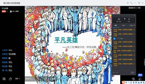 徐润潮引用习近平总书记的话:“伟大出自平凡,英雄出自人民”,进而引出讨论问题“谁是我们的英雄?”启发入党积极分子们在自己的身边寻找答案。之后,他分享一段关于“英雄”的短片,短片中的“平凡英雄”在疫情期间挺身而出,让学员们深入地了解到英雄并不都是伟大的人,他们更多的来自人民。视频中的“平凡言语”:“当我穿上防护服,我已经不再是孩子’、‘非典时期你们保护我们,现在我们长大的,换我们保护你们”让人深受感动。如今,青年依靠青春力量组成的青年突击队冲锋在防疫一线,在疫情中,青年一代成为了中坚力量,他们不畏艰险,冲锋在前,他们是最勇敢,最可爱的“平凡英雄”,希望学员们通过努力和锤炼同样成为一名平凡而伟大的“英雄”。