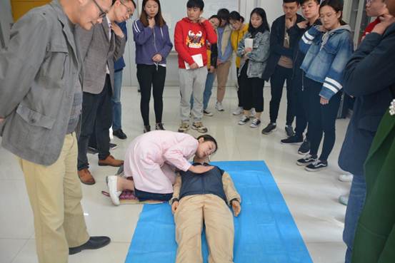 讲座开始,钱东辉主任播放一段急救视频,引出本次讲座的主题——心肺复苏,并详细介绍心肺复苏的操作步骤,让大家对心肺复苏有了初步了解。之后,他邀请护士为大家进行实操授课。此过程中他强调,心肺复苏的关键在于胸外按压、开放气道、人工呼吸这三个步骤,并告诉大家在患者心脏骤停后,最佳的抢救时间为4分钟。演示完毕后,钱主任对我院师生进行现场指导,到场的老师和同学们也都积极踊跃的到人体模型前面进行实操模拟,实践过程中钱主任和在场护士耐心的为我院师生答疑解惑,大家出现的错误也被一一矫正,以确保大家规范掌握此项技能。