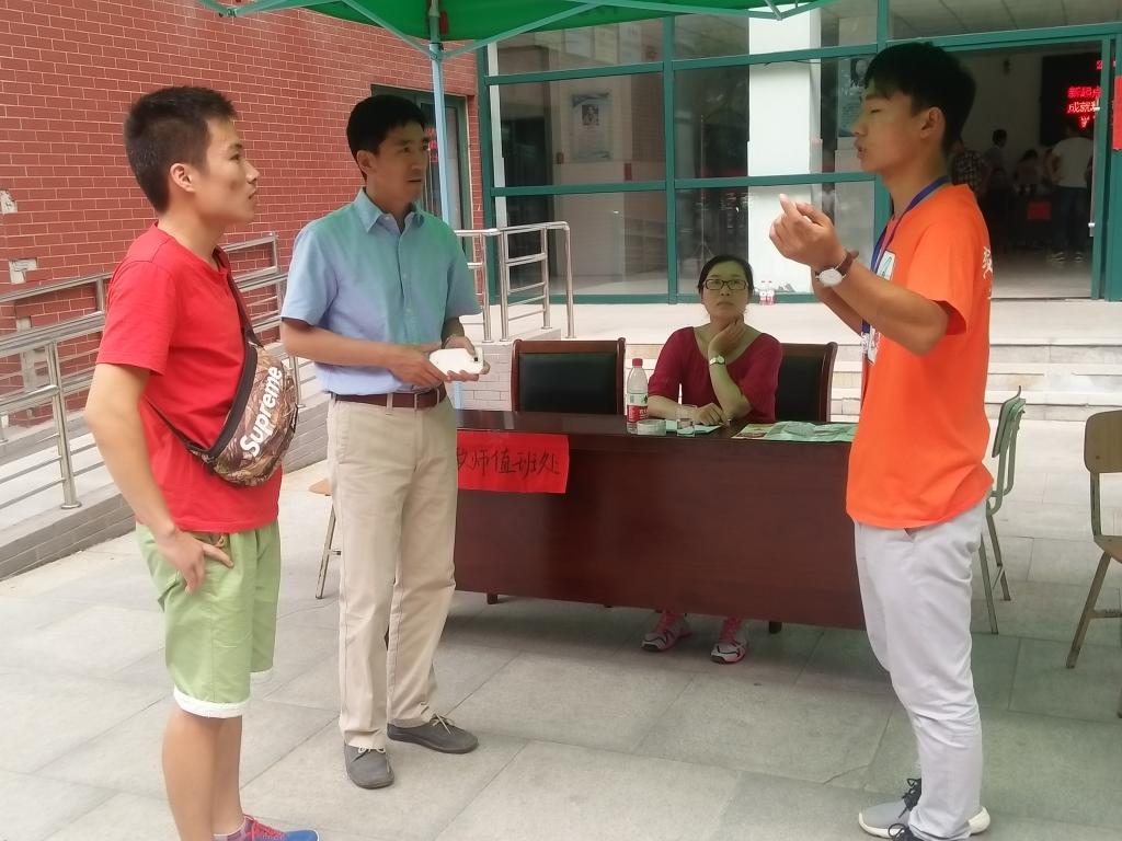 化学化工学院门前的迎新接待处,有一个特殊的接待岗位,是由化学化工学院教师担任志愿者的教师咨询处。“您好!欢迎来到化学化工学院!”教师主动向新生家长问候。家长们就孩子所学专业的疑问、就业去向、奖学金设置等问题积极向老师们进行咨询,老师们热情为家长进行讲解。天气炎热,老师们满头大汗,讲解时间长了口干舌燥,但看到家长们露出灿烂的笑容,所有的疲倦都一扫而去。