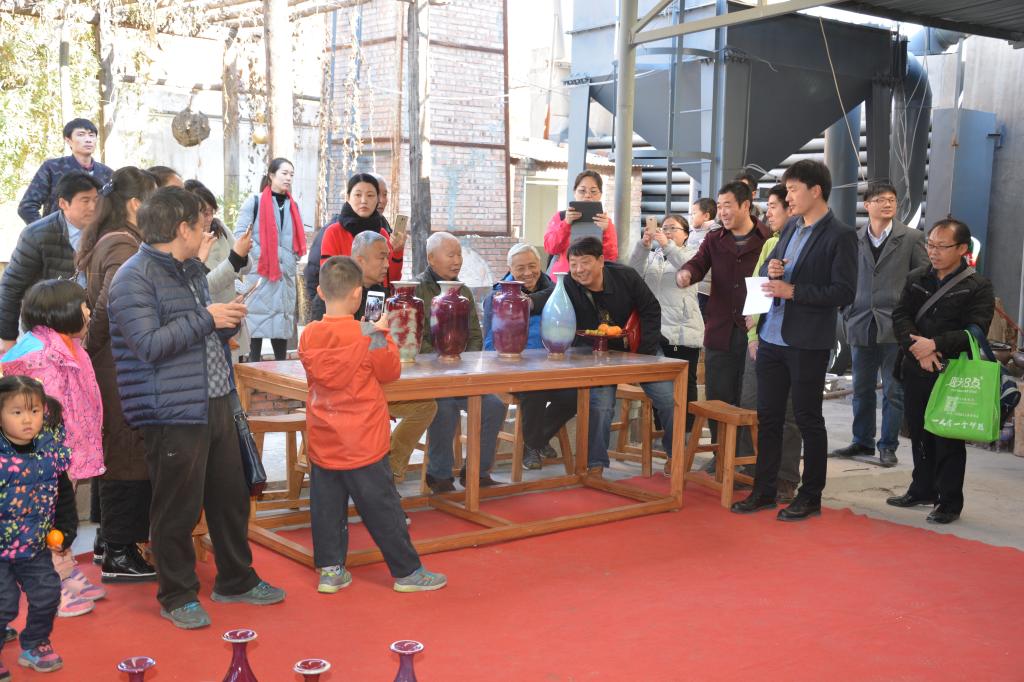 由展厅来到后院,这里是制作和烧制钧瓷器的地方,老师们更是兴趣盎然,和孩子们一起亲自动手用陶泥做起了泥坯。11点多,大家有幸参加了开窑仪式。 ‘入窑一色,出窑万彩’,伴随着一件件钧瓷出窑,大家不发出一阵阵的赞叹声或唏嘘声。俗话说“三句话不离本行”,一些兴趣浓厚的老师更是和崔松伟大师一起探讨起钧瓷窑变的化学原理来。