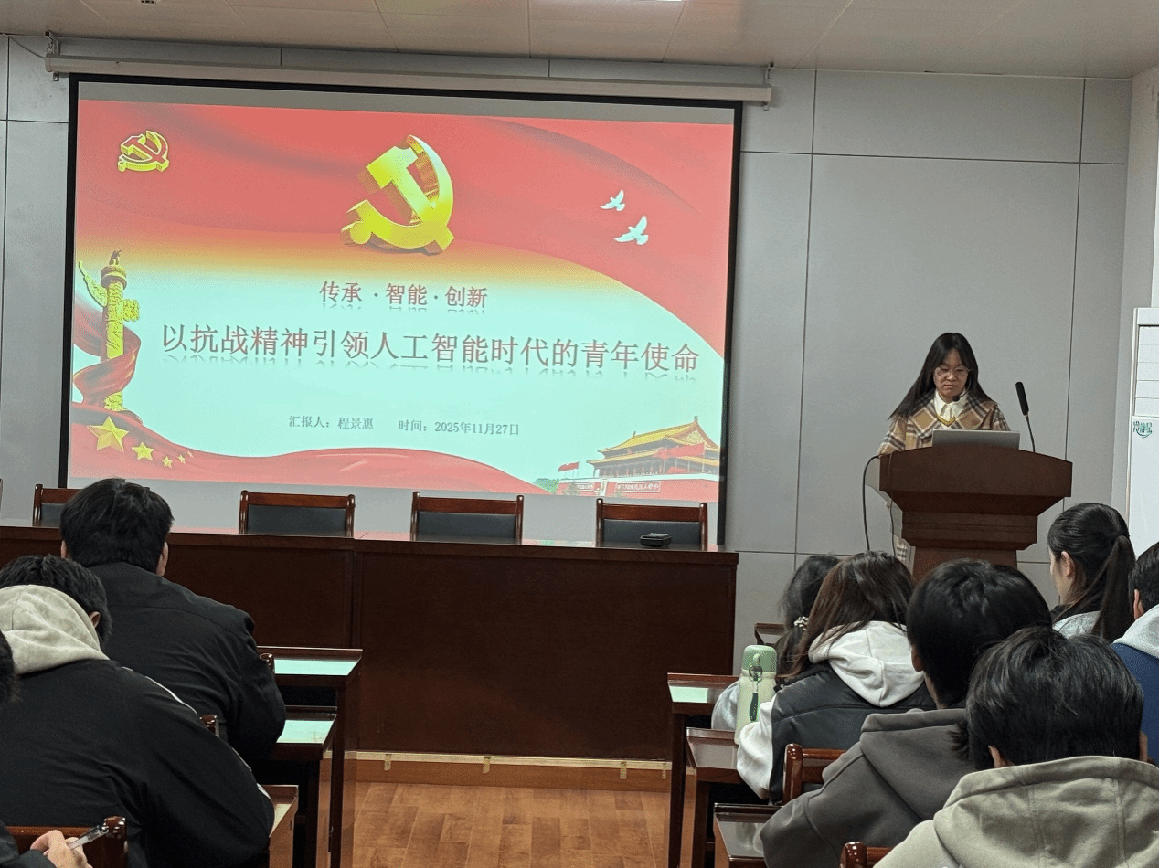 2025年11月27日,我院教工第一党支部在S302教室开展党建品牌活动“专业思政大讲堂”第五讲《以抗战精神引领人工智能时代的青年使命》。本次讲座由支部成员程景惠博士主讲,活动旨在深入贯彻党的教育方针,从历史精神中汲取智慧,探讨化材人在人工智能时代应肩负的责任与担当。