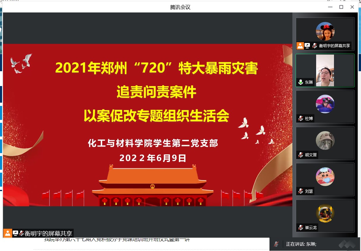 2022年6月9日,我院学生第二党支部以腾讯会议方式召开郑州“7•20”特大暴雨灾害追责问责案件以案促改组织生活会,支部书记张东琳老师和支部全体学生党员参会。