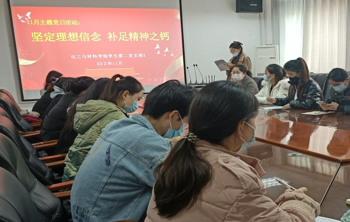 2022年11月18日,我院学生第二党支部在A4-301会议室召开“坚定理想信念 ,补足精神之钙”的主题党日活动,支部书记张东琳老师及全体党员参会。