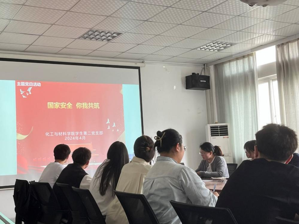 为深入贯彻落实习近平总书记关于加强国家安全教育的重要指示批示精神,不断增强学生党员的国家安全意识和素养,共筑国家安全防线,2024年4月15日,化工与材料学院学生第二党支部在A4-301会议室召开“国家安全·你我共筑”主题党日活动。本次会议由党支部书记张东琳老师主持,支部全体党员参会。