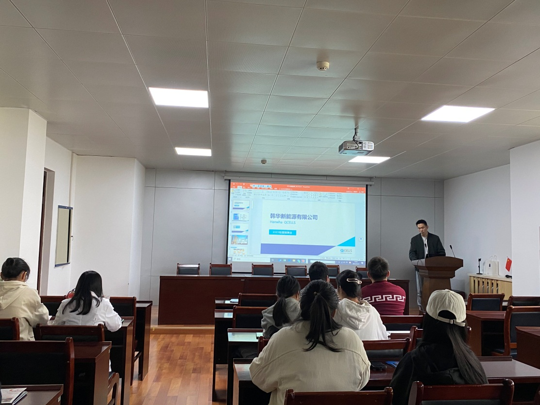韩华新能源有限公司是世界500强韩华集团的全资子公司,是全球领先的光伏制造商,拥有8GW太阳能电池产能和8GW的太阳能组件产能,是全球最大的电池制造商,也是最大的组件制造商之一。宣讲会上,公司HR从企业文化、就业岗位、薪资待遇等方面为同学们做了详细介绍,并解答了同学们提出的问题。