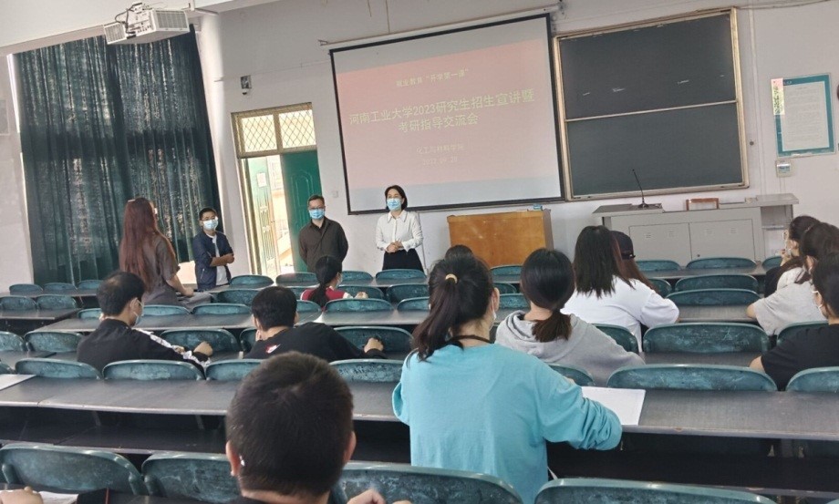 根据前期调研,我院2023届毕业生考研意向人数达二百余人,占毕业生总人数的77%,因此,结合我院实际,本次“开学第一课”以河南工业大学考研宣讲为契机,重点进行考研指导。首先,河南工业大学老师就学校概况、师资力量、入学条件、报考条件及流程、招生录取政策、学校研究生教育情况等方面为大家做出了详尽和细致的解读,让有意报考该校的同学们对学校有了更进一步的深入的了解。会上,李品将副院长鼓励同学们对自己未来的方向选择保持信心,不管是考研还是就业,在剩下的一年时间里有计划有步骤的安排自己的学业和实习活动。最后,张学燕副书记就毕业生就业择业观以及就业相关内容给大家予以宣讲,引导大家树立正确的就业择业观,鼓励青年人就要沉下心来,扎根基层,到祖国需要的地方去,合理规划职业生涯。