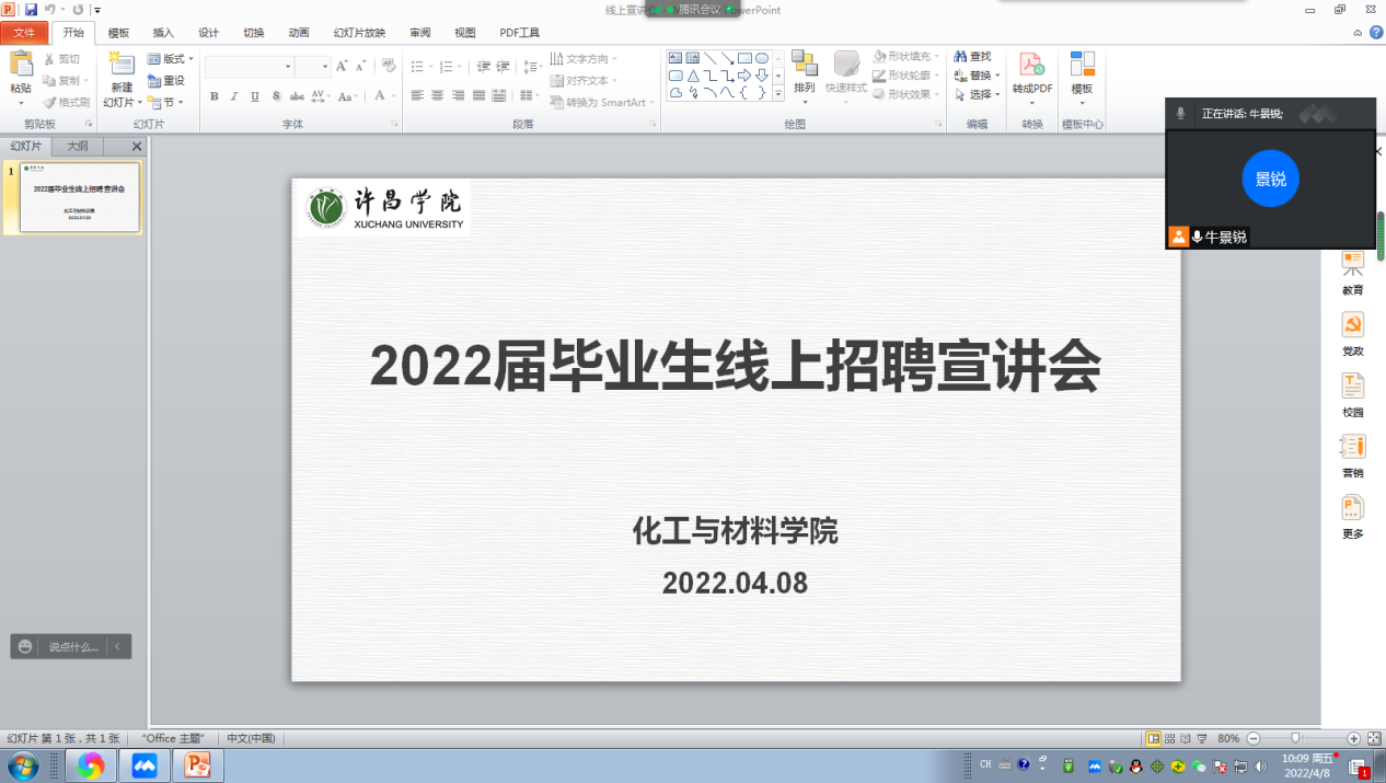 2022年4月8日上午10时,我院组织举行了2022届毕业生线上招聘宣讲会。此次线上招聘宣讲会由我院就业专干牛景锐老师主持,2022届毕业生在线进行观看。