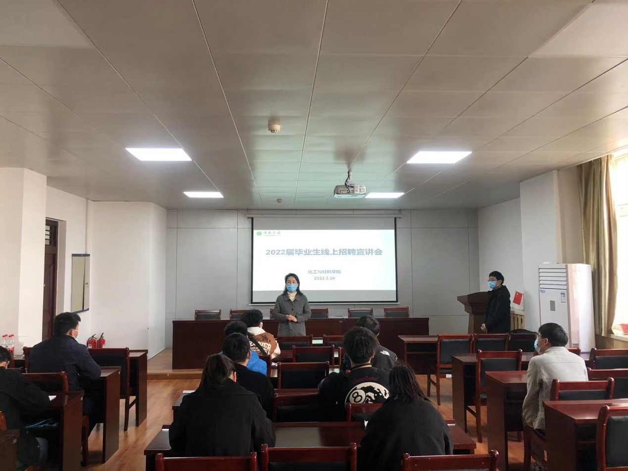 2022年3月24日上午10时,我院在化材楼S302室举行了2022届毕业生线上招聘宣讲会。此次线上招聘宣讲会由我院就业专干牛景锐老师主持,我院党委副书记张学燕老师、毕业班辅导员胡泊老师到现场予以指导,2022届部分毕业生到场参会,其他学生在线进行观看。
