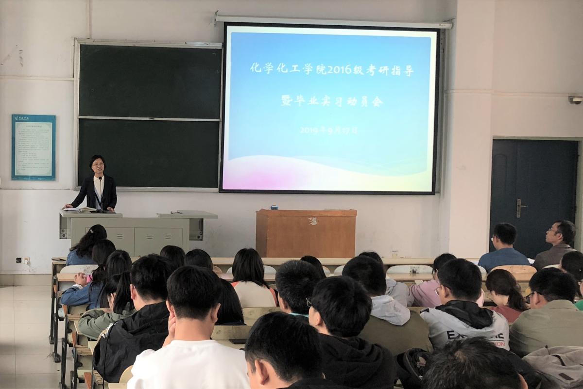2019年9月17日,化学化工学院于B合6教室举办2016级“考研指导暨毕业实习动员”大会,参加此次动员大会的有副院长张艳鸽,应用化学系副主任李浩博士、副主任舒朋华博士,16、18级辅导员胡泊。
