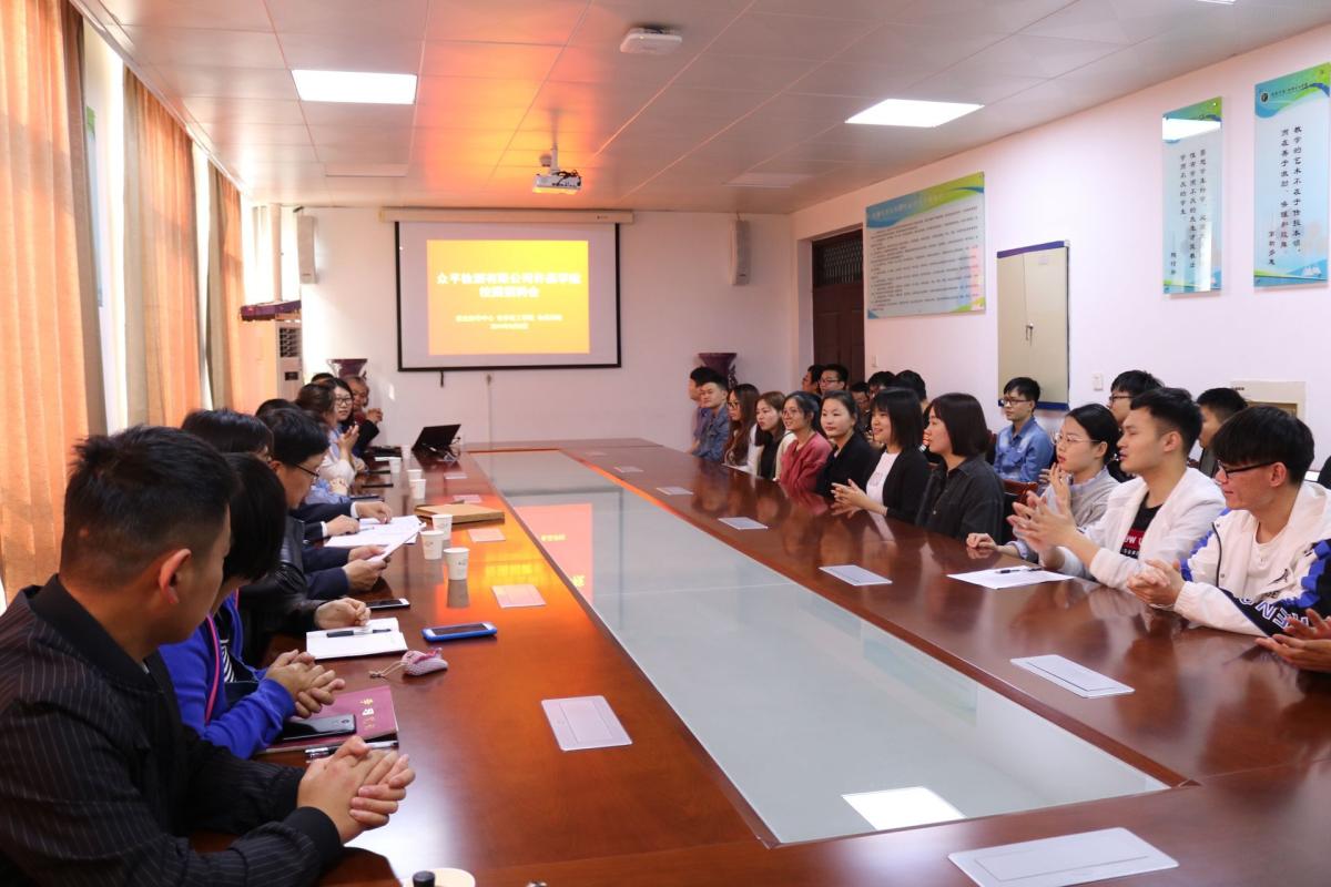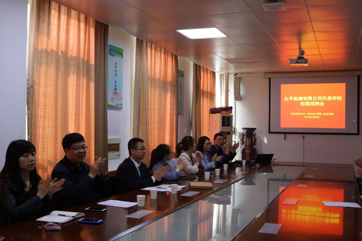 2019年5月8日下午3:30,许昌众平检测有限公司校园专场招聘会在化工楼W-306顺利举行。其中,该公司董事长兼总经理周伟峰、副总经理郭红卫、人事行政部经理丁洋、许昌学院2011届毕业生现任检验检测部经理史真真及两名2018届毕业生现任检验检测技术人员邓瑞瑞、陈洁莅临此次招聘会。许昌学院就业指导中心寇建立和周冰老师、许昌学院化学化工学院就业专干毕业班辅导员胡晶、许昌学院食品与生物工程学院就业专干袁玲及我院部分毕业生到场参加。